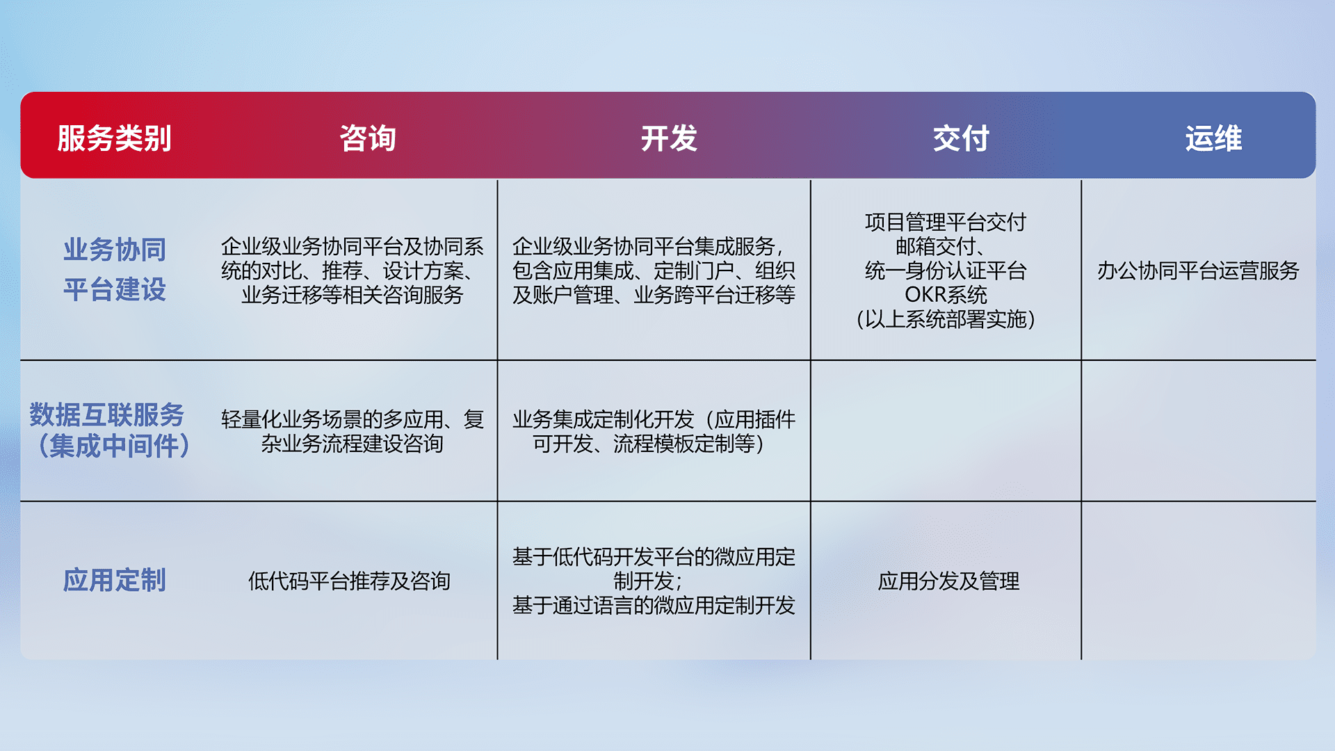 针对钉钉、、、、企微、、IDaas等平台级产品提供产品的规划、、方案、、交付、、定制化开发等服务,,,实现如统一协同办公、、、、智能客户服务、、、、混合会议管理、、、智能数据查询、、、、等业务场景,,,实现数字化转型。。。